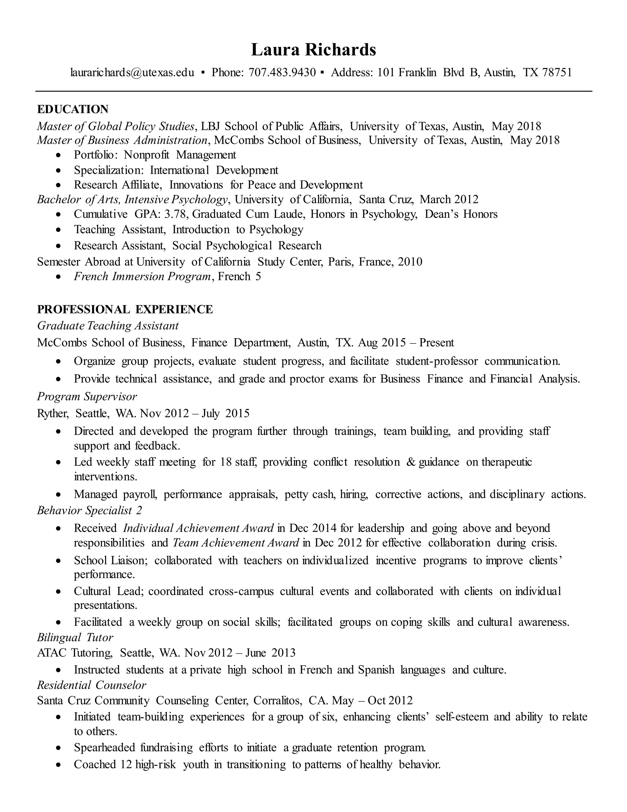 Laura Richards has a Master of Global Policy Studies and MBA from UT Austin, and a BA in Psychology from UC Santa Cruz. She has over 5 years of experience in nonprofit management, program supervision, teaching, and crisis counseling. Her professional roles include graduate teaching assistant, program supervisor, behavioral specialist, tutor, and residential counselor. She also has leadership experience as a crisis hotline responder, ESL instructor, peer counselor, and 4-H camp director. Richards has received several academic and leadership honors. She is proficient in English, French, and basic Spanish with skills in teaching, project management, data analysis, and cultural competency.