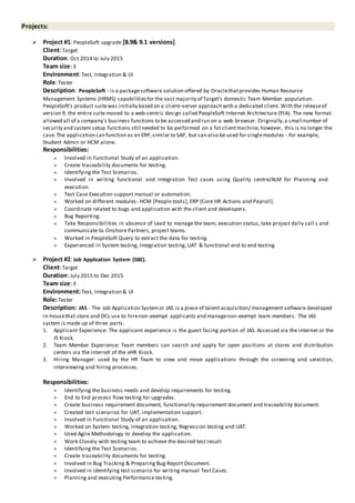 Hemavathy is a software tester with over 1 year of experience in manual testing. She has expertise in black box testing, developing and executing test cases, defect tracking and reporting. She is proficient with testing tools like Quality Centre and has experience testing PeopleSoft upgrades and a Job Application System. Hemavathy holds a Master's degree in Software Engineering and is looking for a position that allows her to utilize her testing experience and contribute to mutual growth.