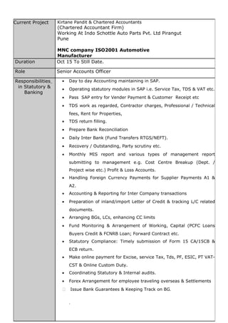 This document is a curriculum vitae for Dashrath L. More. It outlines his objective to offer his skills and abilities to organizations to help drive improvement. It details his educational qualifications including a B.Com and M.Com from Pune University. It provides 8 years of work experience in accounting and finance roles for manufacturing and accounting firms. It describes his current role as a Senior Accounts Officer and previous role as Accounts Officer, outlining responsibilities like accounting, statutory compliance, reporting, and team management. Personal details like address and languages are also included.