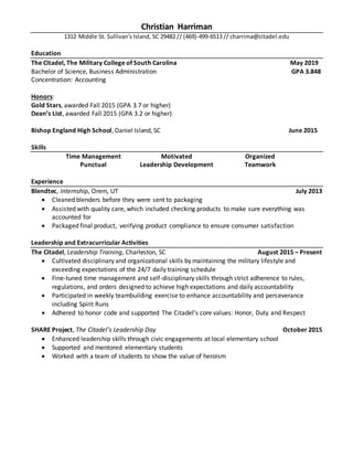 Christian Harriman has a Bachelor of Science in Business Administration with a concentration in Accounting from The Citadel. He maintained a 3.848 GPA and received honors including Gold Stars and being named to the Dean's List. While attending The Citadel, he participated in rigorous leadership training which helped him develop skills in time management, discipline, and teamwork. He also gained work experience through an internship where he assisted with quality control and packaging of blended products.