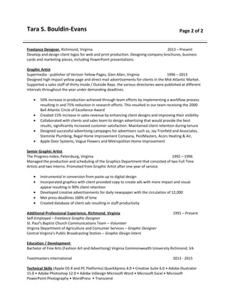 Tara Bouldin-Evans has over 20 years of experience in graphic design and front office roles. She is currently a Front Desk Associate at Bon Air Med Spa, where she greets guests, handles inquiries, and performs administrative tasks. Previously, she was a Graphic Designer and Project Manager at Advertising Concepts, where she designed advertisements for magazines and designed direct mail pieces. She also has experience as a Receptionist and Graphic Designer at Visual Appeal, designing graphic communications for print and web. Bouldin-Evans has extensive freelance design experience developing logos, brochures, and marketing materials. She also has experience as a Graphic Artist for Yellow Pages publications and newspapers.