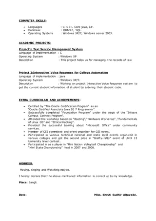 Shruti Sudhir Aitavade is seeking a position that allows her to continue updating her skills in accordance with new trends. She has a B.E. in Computer Science and Engineering from Dr.J.J.Magdum College of Engineering with consistently good grades. Her skills include languages like C, C++, Java and C#, databases like Oracle and SQL, and operating systems like Windows XP/7 and Windows Server 2003. She has experience with academic projects in areas like a taxi management system and an interactive voice response system for a college.