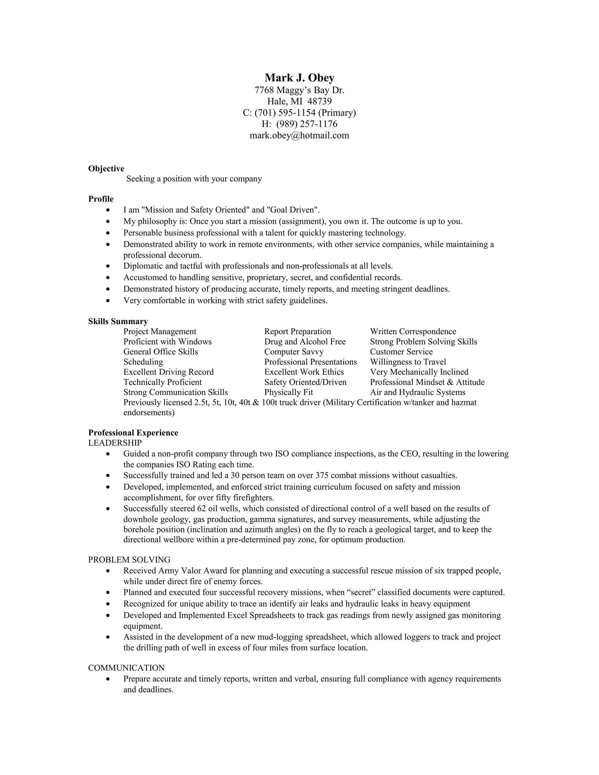 The document is a resume for Mark J. Obey seeking a new position. It lists his contact information, objective, skills, and extensive professional experience including leadership roles in the military, firefighting, oil industry, and various maintenance and logistics roles. It highlights his strengths in safety orientation, problem solving, communication, and technical proficiency across multiple industries.
