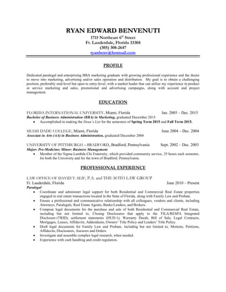 This document is a resume for Ryan Edward Benvenuti. It summarizes his professional experience as a paralegal, office facilitator, sales associate, and returns and repairs clerk. His education includes a Bachelor's degree in Marketing from Florida International University and an Associate's degree in Business Administration from Miami Dade College. His goal is to obtain a mid-level or entry-level position in marketing, advertising, sales, operations or distribution utilizing his experience in marketing, sales, promotions, and account management.