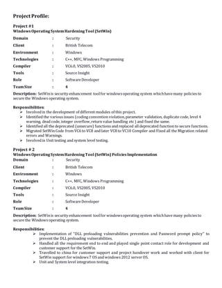 Arvind Raghuwanshi has over 4 years of experience developing networking protocols and operating system hardening using C and C++. He has worked on projects for Huawei Technologies in Bangalore, including developing a Windows operating system hardening tool for British Telecom. He is currently developing the FILLP protocol to increase throughput over 90% using TCP and UDP concepts. Arvind has experience with Agile processes and tools like Visual Studio, gcc, and Source Insight. He is proficient in C, C++, Windows programming, and protocols like TCP, UDP, and SCTP.