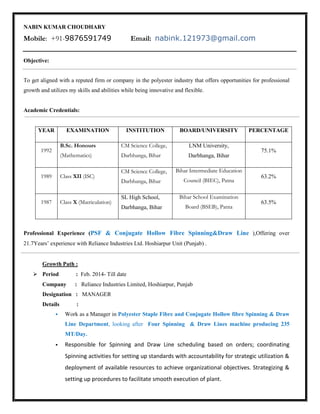 Nabin Kumar Choudhary has over 21 years of experience in polyester fiber production with Reliance Industries Ltd. He currently holds the position of Manager in the Polyester Staple Fiber and Conjugate Hollow Fiber Spinning & Draw Line department, overseeing four production lines. Previously he worked as Shift Engineer and Assistant Technical Officer. He has expertise in fiber manufacturing processes, quality control testing, machine maintenance, and achieving production targets. His skills include production planning, process optimization, and team leadership.