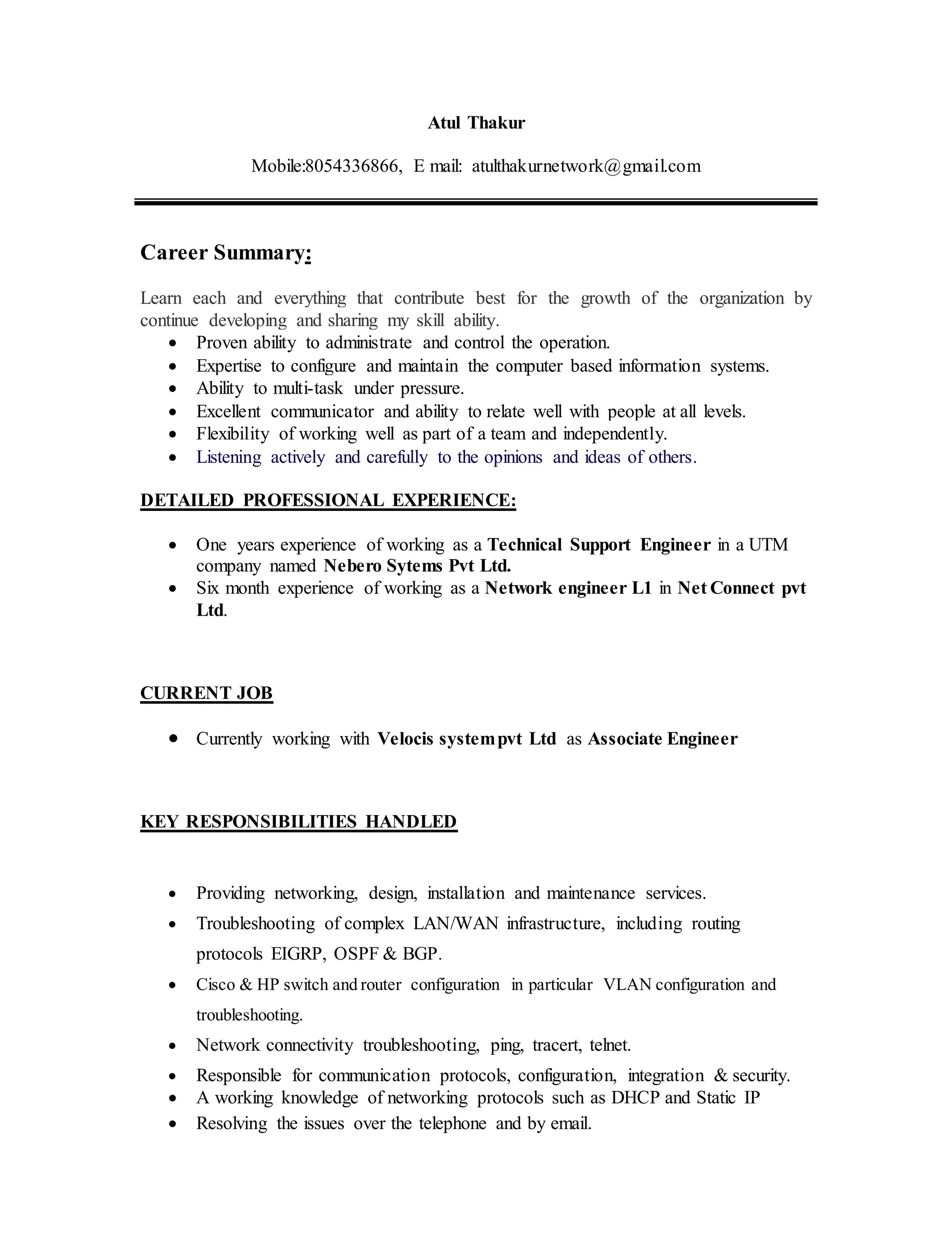 Atul Thakur is a network engineer seeking a position with strong experience in networking, IT support, and systems administration. He has over 2 years of experience working as a technical support engineer and network engineer for various companies. His skills include Cisco and HP router/switch configuration, Linux administration, web/mail server management, and troubleshooting networking issues both on-site and remotely. He has a Diploma in Electronics and Communication and a B.Tech in Computer Science and Engineering.