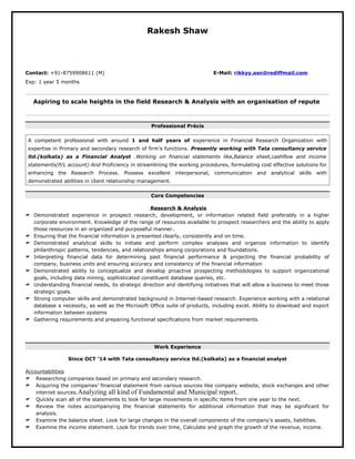 Rakesh Shaw is a financial analyst with over 1.5 years of experience researching companies and analyzing financial statements. He currently works for Tata Consultancy Services in Kolkata, where his responsibilities include primary and secondary research on companies, acquiring and analyzing financial statements, presenting findings in PowerPoint, and resolving queries from a team of 210 people. He has a M.Com degree from Burdwan University and skills in Microsoft Office, SQL, Excel tools, and Tally accounting software. He is seeking new opportunities to advance his career in research and analysis.