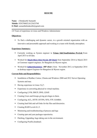 Dintakurthi Sumanth is seeking a challenging career in a growth-oriented organization. He has 2.8 years of experience as a Linux and Windows administrator. He is currently working as a system engineer for Trianz It&CloudSolution Pvt.Ltd, where he installs and configures operating systems, virtual machines, networking, storage, firewalls, and monitoring tools. Sumanth has a BSC in mechanical engineering and is pursuing an MSC in IT. He has technical skills in Linux, Windows server, networking, and virtualization technologies.