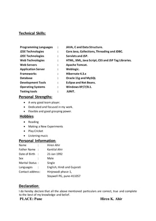 Hiren Ahir has a B.Tech in computer science and engineering with proficiency in Java programming. He completed a project developing a web-based quiz game using technologies including HTML, JavaScript, XML, TCP/IP, Tomcat, Servlet, JSP, Java Beans, Oracle10g, and Windows operating systems. He has skills in Java, C, data structures, core Java, collections, threading, JDBC, servlets, JSP, HTML, XML, JavaScript, CSS, Apache Tomcat, WebLogic, Hibernate, Oracle 11g, and MySQL. His personal strengths include being a good team player, dedicated to his work, and flexible with a good ability to learn.