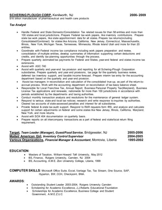 Dwanah Sumo Dwanah has over 8 years of experience in federal, state, and local tax compliance and planning with major corporate tax departments. She has a Masters in Taxation and experience preparing tax returns, estimated payments, and addressing notices for many states. Dwanah also assists with tax provisions, audits, process improvements, and tax software. She is proficient in Microsoft Office, tax research tools, and ERP systems.