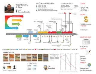 Ricardo Valls is a senior geologist with over 30 years of experience in mining exploration projects around the world. He holds an M.Sc. in geology and is a registered Professional Geologist (P.Geo.) in Ontario, Canada. Valls has worked as a geologist for mining companies in Cuba, Russia, Ghana, Haiti, Canada, El Salvador, Guatemala, the Dominican Republic, and elsewhere. He has served as Chief Geologist, Vice President of Exploration, and President and CEO for various companies. Valls is currently open to new opportunities and his contact information is provided.