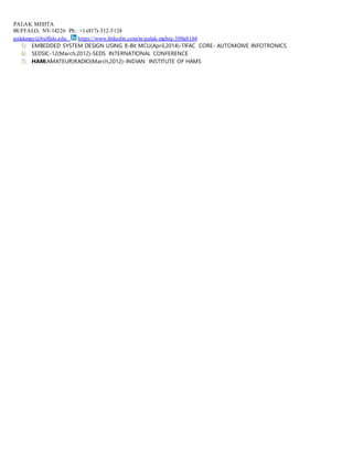 Palak Mehta received a Master's degree in Electrical Engineering from the University of Buffalo in 2017 with a GPA of 3.4/4.0 and a Bachelor's degree in Electronics and Communications from VIT University in 2015 with a GPA of 7.5/10.0. She has work experience with ONGC in Ahmedabad, India working on WiMAX technology and SCADA systems. Her skills include programming languages like C, C++, and Python as well as tools like MATLAB, ADS, FPGA, and PCB design software. She has experience with several projects involving wireless communications, signal processing, wearable antennas, and human pose estimation. She currently works for NASA RASC-AL on