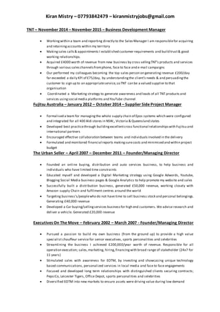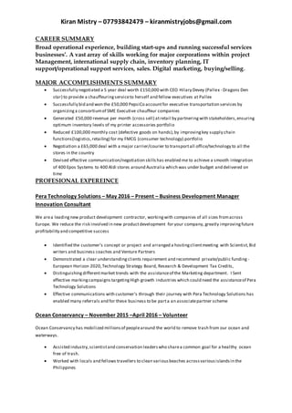 Kiran Mistry has over 20 years of experience in business development, project management, inventory planning, and supply chain roles. He has a proven track record of successfully generating revenue, negotiating deals, and delivering projects on time and under budget. Notable achievements include generating over £150,000 in revenue through a transportation services deal and implementing an EPOS system rollout for 400 stores across multiple countries.