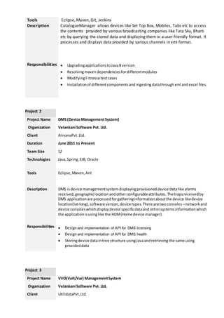 Debabrata Pan is a software engineer with 3 years of experience seeking a challenging position in the software industry. He has skills in Java, Spring, Hibernate, Oracle, and agile methodologies. He has worked on projects including a catalogue management system, device management system, volt/var management system, and license manager. His educational background includes an MCA and OCJP certification.