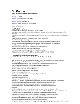 Bo Garcia has over 13 years of experience in the oil and gas pipeline industry, including roles as a pipe designer, construction supervisor, maintenance operator, boilermaker, and pipefitter. He is proficient in AutoCAD, CADWorks Plant, P&IDs, and other design software. Currently he works as the Lead As-Built Draftsman at Kinder Morgan, where he oversees projects, coordinates with third parties, and ensures drawings meet standards.