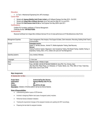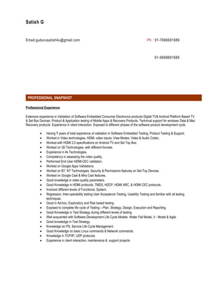 Satish G has over 7 years of experience in software testing, including validation of embedded software for consumer electronics like digital TVs and Android TV devices. He has expertise in testing video and audio functionality, HDMI protocols, 4K technologies, and Google and mobile apps. Satish aims to leverage his experience in testing lifecycles, strategies, and techniques to contribute to high-quality software and client projects.