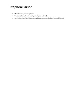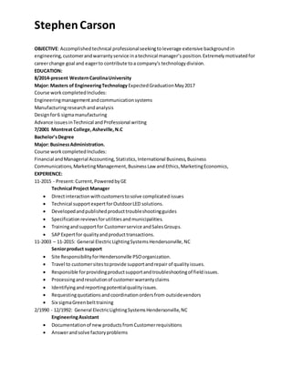 Stephen Carson is seeking a technical manager position and has over 15 years of experience in engineering, customer service, and warranty support. He has a Master's degree in Engineering Technology from Western Carolina University and a Bachelor's degree in Business Administration. Currently, he is a Technical Project Manager at Current, Powered by GE, where he provides technical support, troubleshooting guides, specification reviews, and training. Previously, he held senior product support and engineering assistant roles at GE Lighting Systems, where he interfaced with customers, processed warranty claims, and identified quality issues.
