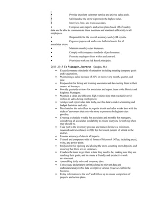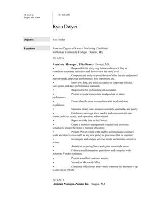Ryan Dwyer has over 7 years of experience as an associate manager and assistant manager in retail stores. He is proficient in analyzing sales data, preparing reports, hiring and training staff, and ensuring stores meet corporate objectives. He maintains strong customer service skills and can effectively communicate goals and policies to employees. Dwyer has a marketing degree and is skilled with Microsoft Office applications.