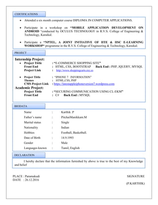 This curriculum vitae is for Karthik P, who completed a B.Tech in computer science from RVS College of Engineering in 2016. He has skills in programming languages like C, C++, Java, and scripting languages like jQuery, AngularJS, and PHP. He has experience with frameworks like .NET and OpenCart. Some of Karthik's projects include an e-commerce shopping site built with HTML, CSS, Bootstrap, PHP, and MySQL and an iPhone 7 information site built with HTML, CSS, and PHP. He is interested in web development, UI development, and has completed internships at Lenovo and Blaze Web Services.