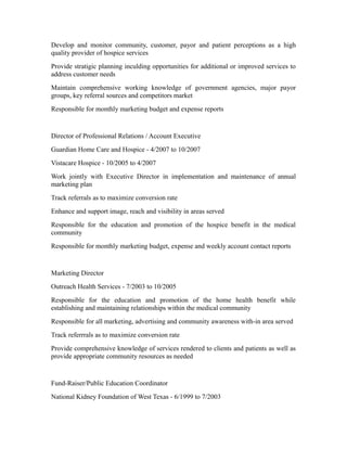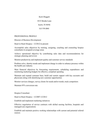 The document provides a professional profile for Kerri Doggett, including her work history and accomplishments. She is currently the Director of Business Development at Heart to Heart Hospice, where she trains and coaches hospice consultants to accomplish sales objectives. Previously, she held various marketing, sales, and business development roles at several hospice and home health organizations, where her responsibilities included developing marketing initiatives, managing budgets, and maintaining relationships with referral sources. She has received several awards for her work, including the Shining Star Award in 2013, 2014, and 2015 from Heart to Heart Hospice.