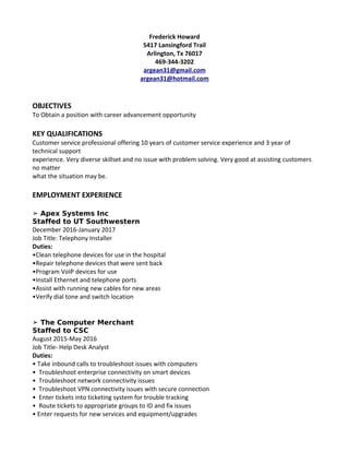 This resume is for Frederick Howard, seeking a career opportunity with advancement potential. He has 10 years of customer service experience and 3 years of technical support experience. His experience includes roles in technical support, customer service, and installation/repair for companies in various industries such as healthcare, computer services, telecommunications, financial services, and more. He has strong technical skills as well as excellent customer service and communication skills.