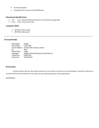 This document contains a summary and resume for RATHEESH.R. It summarizes his personal and professional experience. He has over 10 years of experience in luxury jewelry retail, specifically with diamonds and gold. Currently he works as the Diamond Jewelry In charge for KALYAN JEWELLERS in Kuwait, where his responsibilities include managing staff, achieving sales targets, customer service, and inventory management. His skills include sales, customer relations, promotions, and computer proficiency.