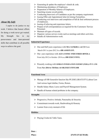 This curriculum vitae is for Pawan Kumar, who lives in Sainipura, Gurgaon. He has a B.A. from H.L.G. Govt. College and an MBA from PTU. He has over 5 years of experience in human resources roles. Currently he works as a Senior Executive for HR at Simran International Export (India) Pvt. Ltd, where his responsibilities include managing HR functions like payroll, leave, and employee relations. His strengths include having a positive attitude and being hardworking and honest.