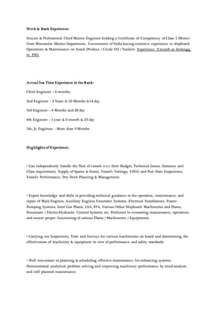 1) Rahul has over 11 years of experience as a Marine Engineer, holding a Class 1 Certificate of Competency. He has served as Chief Engineer and held various engineer roles.