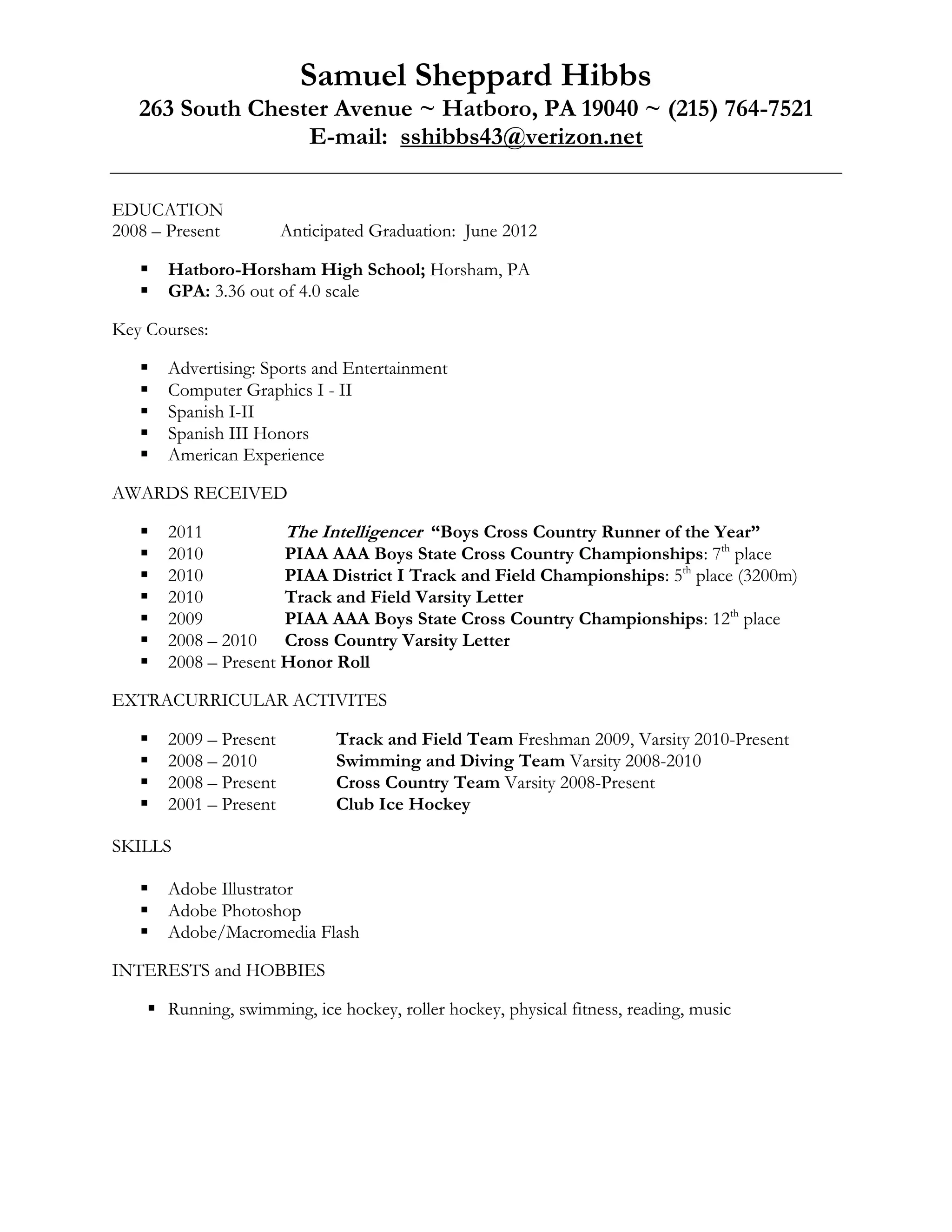 This document summarizes a student's education and extracurricular activities. The student attended Hatboro-Horsham High School from 2008 to 2012 and maintained a 3.36 GPA, taking courses such as advertising, computer graphics, and Spanish. They received several awards for their performance in cross country and track competitions from 2010 to 2011. During high school, the student was involved in cross country, track and field, swimming, and ice hockey teams from 2008 to present. Their skills include Adobe software and interests include running, swimming, and various forms of hockey.