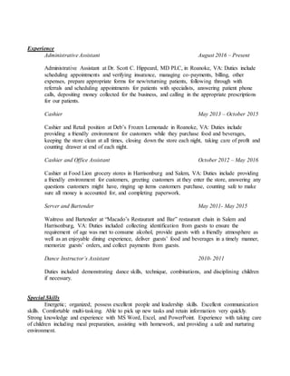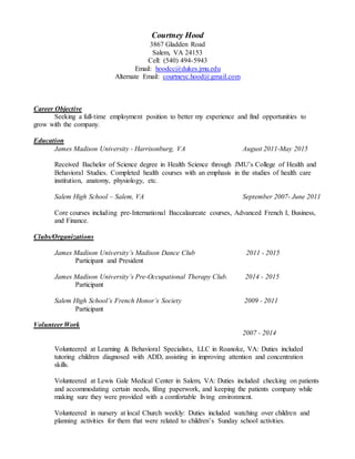 Courtney Hood is seeking a full-time position to further her experience and career growth. She received a Bachelor's degree in Health Science from James Madison University, where she was president of the Madison Dance Club and a member of the Pre-Occupational Therapy Club. Her volunteer experience includes tutoring children with ADD and assisting patients at a medical center. Currently she works as an administrative assistant for a doctor's office, with duties like scheduling appointments, billing, and prescription management. She also has retail and food service experience from various cashier and server roles. Hood's skills include organization, leadership, communication, and proficiency with Microsoft Office programs.