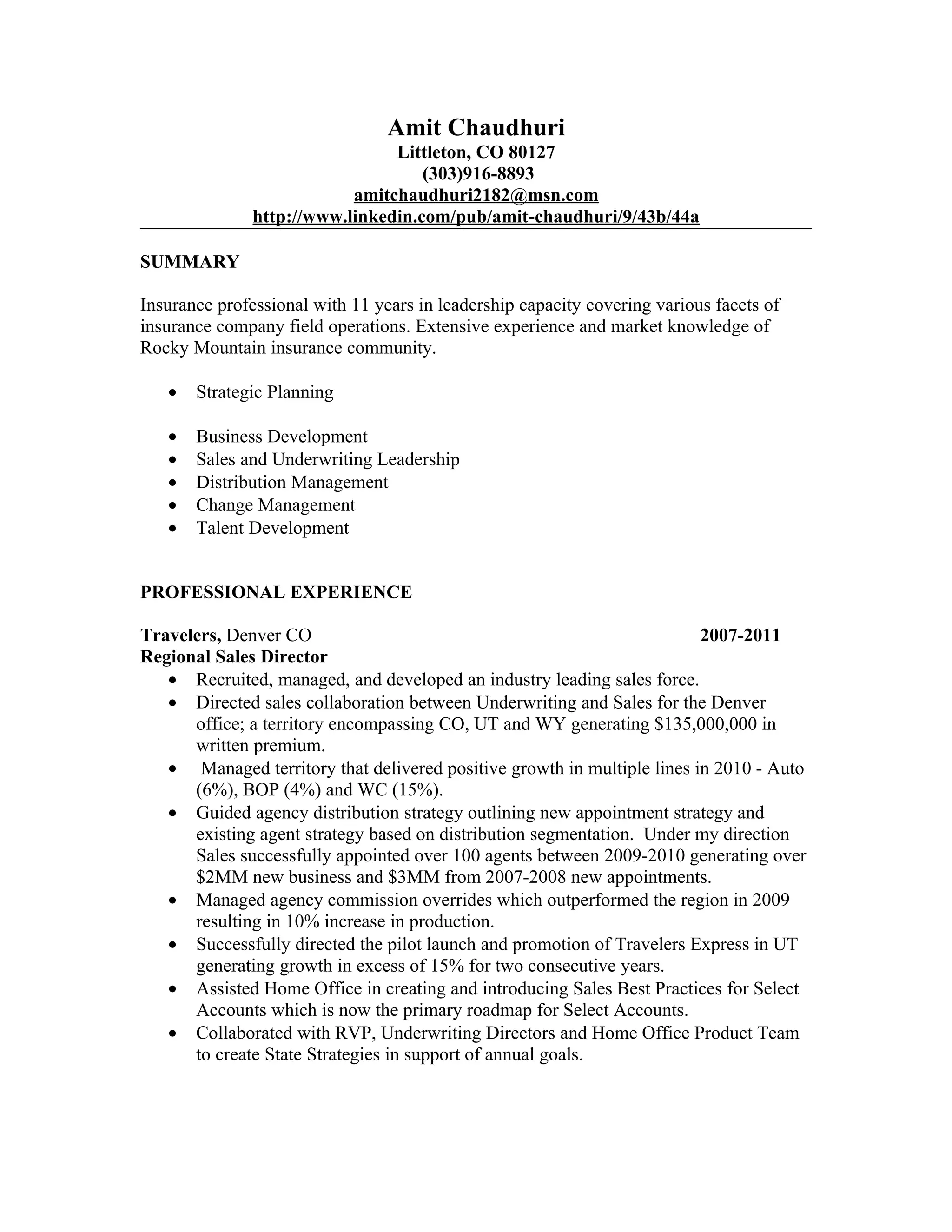 This document is a resume for Amit Chaudhuri summarizing his experience in insurance leadership roles over the past 11 years. It outlines his experience in strategic planning, business development, sales and underwriting leadership, distribution management, and talent development. It then provides details of his roles and accomplishments at various insurance companies.