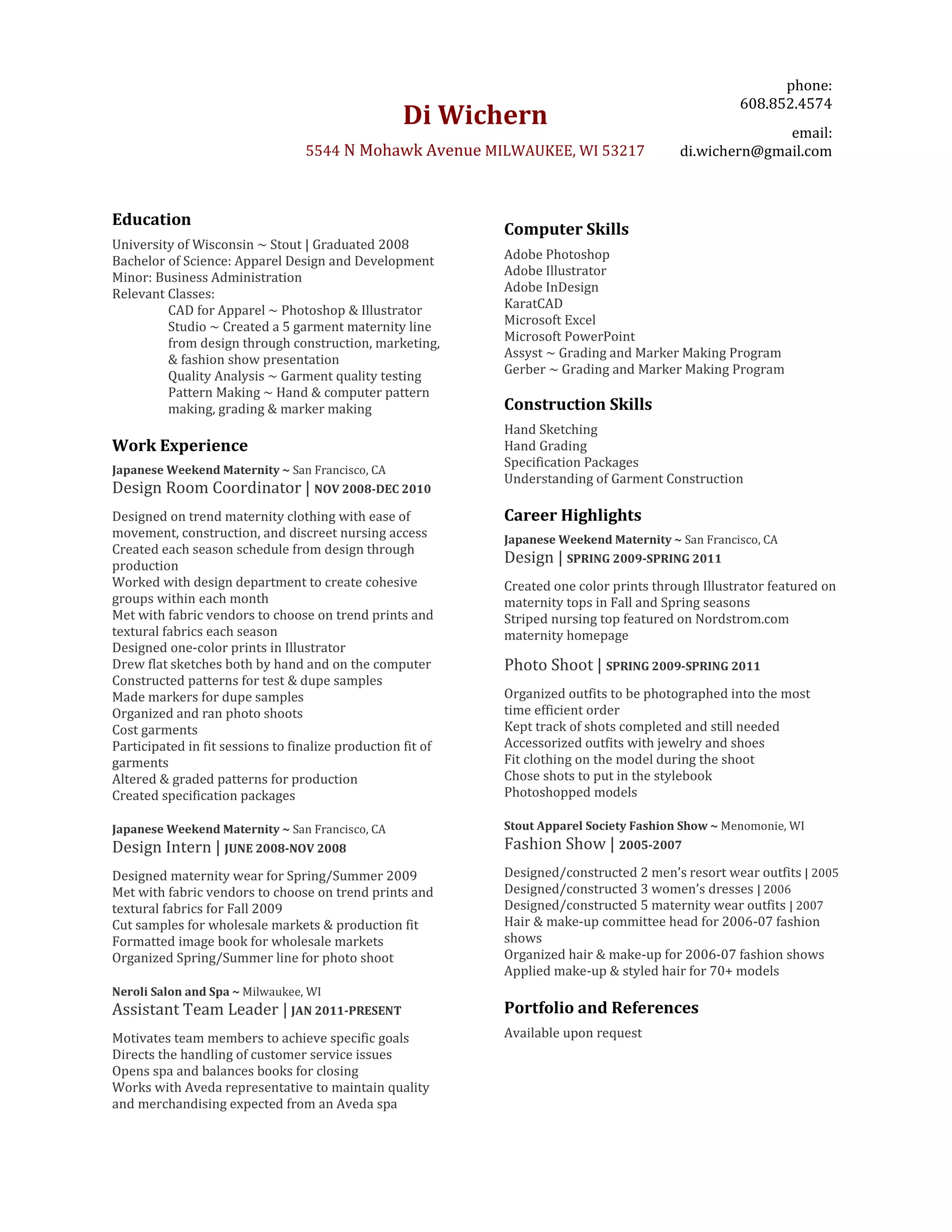 Di Wichern has over 8 years of experience in apparel design and development, including maternity wear design. She graduated from the University of Wisconsin-Stout in 2008 with a Bachelor's degree in Apparel Design and Development and a minor in Business Administration. Her work experience includes designing maternity clothing lines and coordinating photo shoots for Japanese Weekend Maternity in San Francisco. She is currently an Assistant Team Leader at Neroli Salon and Spa in Milwaukee.