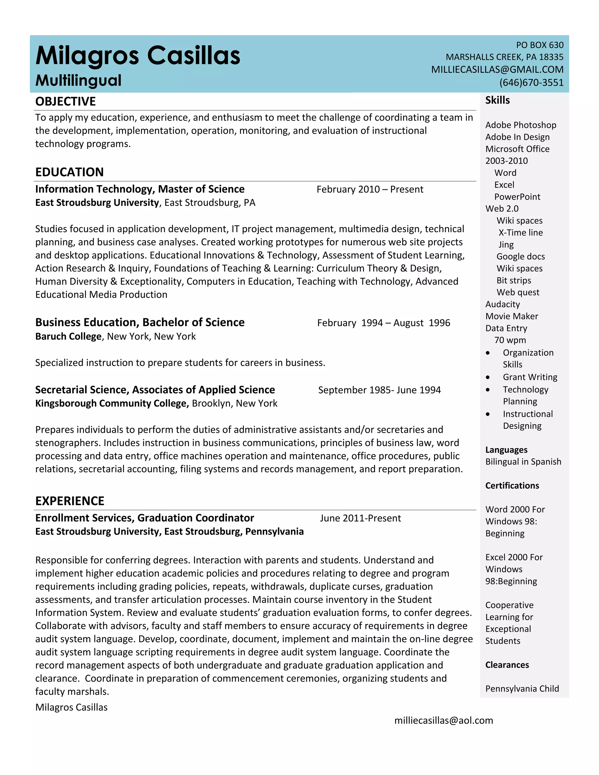The document provides a summary of Milagros Casillas' qualifications and experience. It includes her objective to coordinate instructional technology programs. It then outlines her education background including degrees in information technology, business education, and secretarial science. The bulk of the document lists her work experience in roles such as graduation coordinator, graduate assistant, manager, substitute teacher, assistant director, and Spanish teacher. It also includes a list of skills, activities, awards and languages.