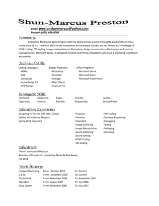 The document provides a summary, contact information, technical skills, intangible skills, education experience, and work history of an interactive media and web designer. The designer has skills in HTML, CSS, Photoshop, and can take a client's ideas and turn them into viable digital designs. They have a Bachelor's degree in interactive media and web design and experience working at various companies.
