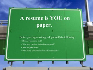 A resume is a personal advertisement that should highlight your qualifications, experiences, talents, and what makes you stand out. You should tailor your resume and cover letter specifically to each job by focusing on what the employer is looking for. Keep your resume to no more than two pages and include relevant information such as education, work experience, skills, and accomplishments. The cover letter should introduce your interest in the job and qualifications in a brief and concise manner.