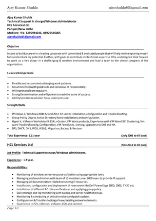 Ajay Kumar Shukla is a Technical Support in Charge and Windows Administrator with over 5 years of experience, specializing in server installation, configuration, and troubleshooting across various Windows platforms and virtualization technologies. His work includes managing IT support for over 2000 users, leading teams, and ensuring compliance with project timelines and documentation. He holds a B.Tech in Electronics and Communication Engineering and certifications in cloud computing and virtualization.