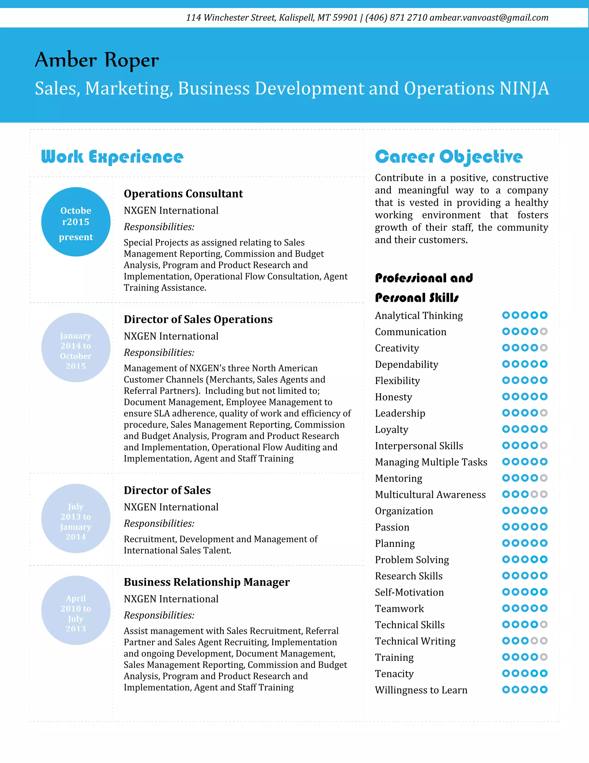 This document is Amber Roper's resume. It outlines her career objective to contribute positively to a company that fosters staff, community, and customer growth. It then lists her extensive sales, marketing, operations, and customer service experience with NXGEN International and other companies, as well as her educational background and references. Her experience includes roles as an Operations Consultant, Director of Sales Operations, Director of Sales, and Business Relationship Manager at NXGEN International, among others. She also attended the University of Montana and Westwood University for marketing degrees.