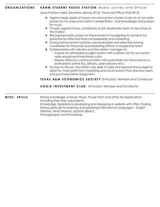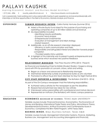 Pallavi Kaushik is an aspiring economist and business model architect with experience in research and relationship management. She has held internships and leadership roles, including a summer research internship at Collins Family Ventures and serving as the financial and marketing chair at Free Press Houston. Her education includes a Bachelor's degree in Economics from Texas A&M University, along with a business minor, and she possesses strong skills in various software applications and languages.