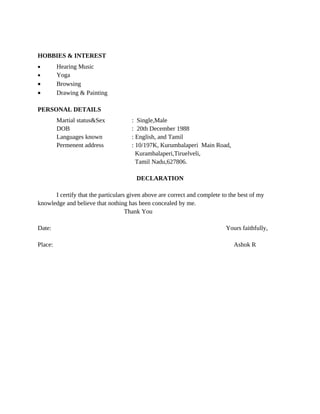 Ashok R is seeking a challenging position to continuously learn, create, and contribute to an organization using his technological and managerial skills. He has a B.E in Electronics and Communication Engineering from Einstein College of Engineering in Tirunelveli with 72% and has experience with languages like C, C++, Embedded C, and Java as well as simulation tools and technologies involving embedded systems, VLSI, and circuit design. In his free time, Ashok enjoys listening to music, yoga, browsing, and drawing/painting.
