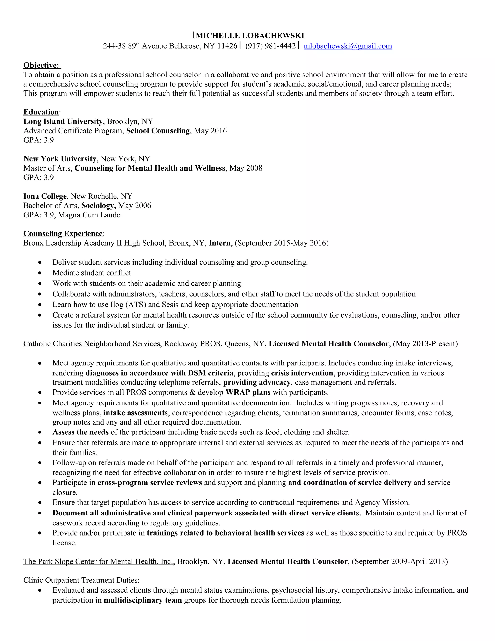 Michelle Lobachewski has extensive experience as a school counselor and mental health counselor. She has a master's degree in counseling and an advanced certificate in school counseling. Her experience includes interning at a high school where she provided individual and group counseling to students and collaborated with other staff. She also has experience providing counseling services to individuals and families through various organizations. Her goal is to obtain a position as a school counselor to create a comprehensive counseling program that supports students' academic, social, emotional, and career needs.