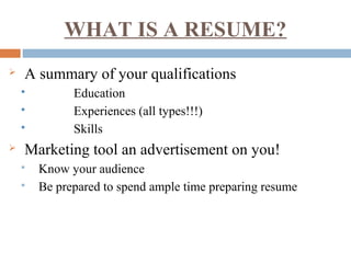 This document provides information and tips about creating an effective resume. It discusses what a resume is, different resume formats including reverse chronological and skills-based, common resume sections like education, experience, and skills, cover letter tips, and final resume advice. The reverse chronological format that emphasizes work history is generally preferred by employers. Customizing the resume for each position by highlighting the most relevant qualifications is important.