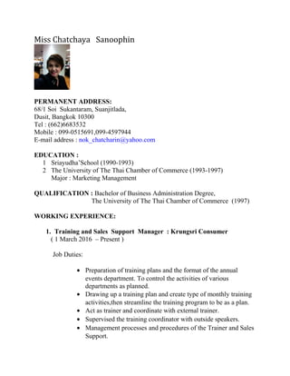 Miss Chatchaya Sanoophin has over 15 years of experience in marketing, sales management, and customer service roles. She is currently the Training and Sales Support Manager at Krungsri Consumer, where she develops training programs, coordinates with trainers, and manages personnel. Previously she was the Branch Manager at Bupa Health Insurance Thailand and held sales management positions at several other companies. She has a Bachelor's degree in Marketing Management and is proficient in English, Thai, and Microsoft Office.