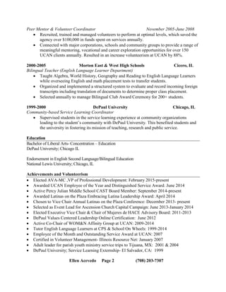 Ellen Acevedo has over 15 years of experience in community outreach and volunteer management. She currently works as an RSVP Project Specialist at AARP, where she facilitates a senior volunteer program and represents AARP in the community. Previously, she held roles at UCAN such as External Affairs Manager, Mentor Coordinator, and Peer Mentor & Volunteer Coordinator, where she collaborated with partners to secure funding, increase volunteerism, and mentor youth. Acevedo has a bachelor's degree from DePaul University and experience teaching English Language Learners.