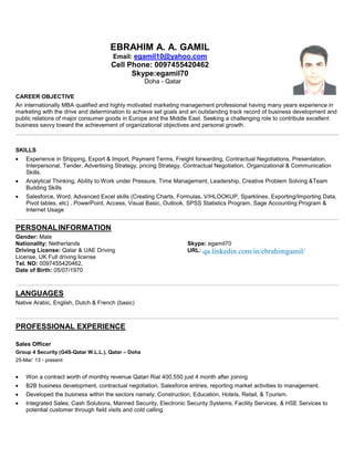 Ebrahim A. A. Gamil is a marketing professional seeking a challenging role. He has over 20 years of experience in marketing roles across Europe and the Middle East. His skills include experience in shipping, sales, negotiations, and developing marketing strategies. He is proficient in business software and data analysis tools. Ebrahim holds an MBA in human resources management and a bachelor's degree in marketing management.