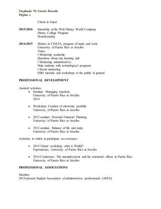 Stephanie Garcia Rosado is seeking an administrative assistant position where she can utilize her skills in Microsoft Office, organization, document management, and ability to work under pressure. She has a bachelor's degree in office systems from the University of Puerto Rico at Arecibo and relevant experience at Ricos Sun Tour and Disney World. Her education included courses in business documents, electronic correspondence, emerging office technologies, and medical billing.