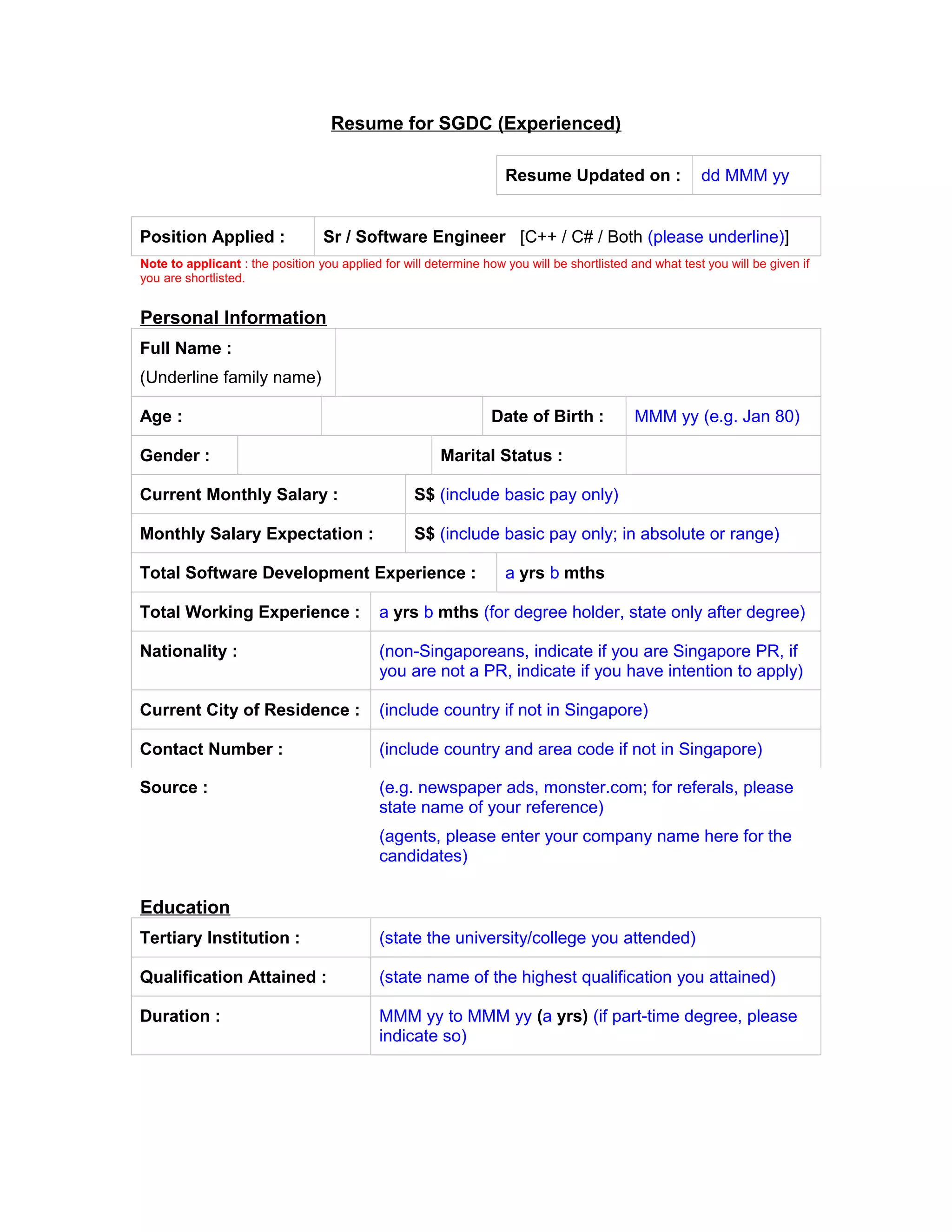 This resume template is for experienced software engineers applying for positions at SGDC. It requests personal information, education history, detailed work experience on software projects, skills, and courses. Projects details include role, technologies used, and percentage of time spent on activities like management, requirements, design, coding, testing, and maintenance. The total for each project must add up to 100%.
