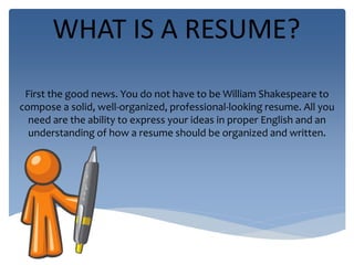 This document provides tips for writing an effective resume. It recommends including unique and interesting information to stand out, limiting fonts to two choices such as Times New Roman and Arial for headings, and starting with contact information including name, address, phone number and email. It also recommends including an objective of no more than two lines, listing educational and employment history in reverse chronological order, achievements and awards, skills, and some important tips like using power words and including a passport photo.
