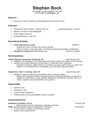 Stephen Bock is a senior at Pennsylvania State University studying Risk Management with an expected graduation date of June 2017. He has experience in landscaping and food service jobs developing skills in teamwork, customer service, and communication. Bock played varsity lacrosse in high school and club lacrosse, teaching him leadership and responsibility. Currently, he is a committee member of THON fundraising for pediatric cancer and has raised over $2100. His goal is to obtain a risk management internship for summer 2015 to further his education and career.