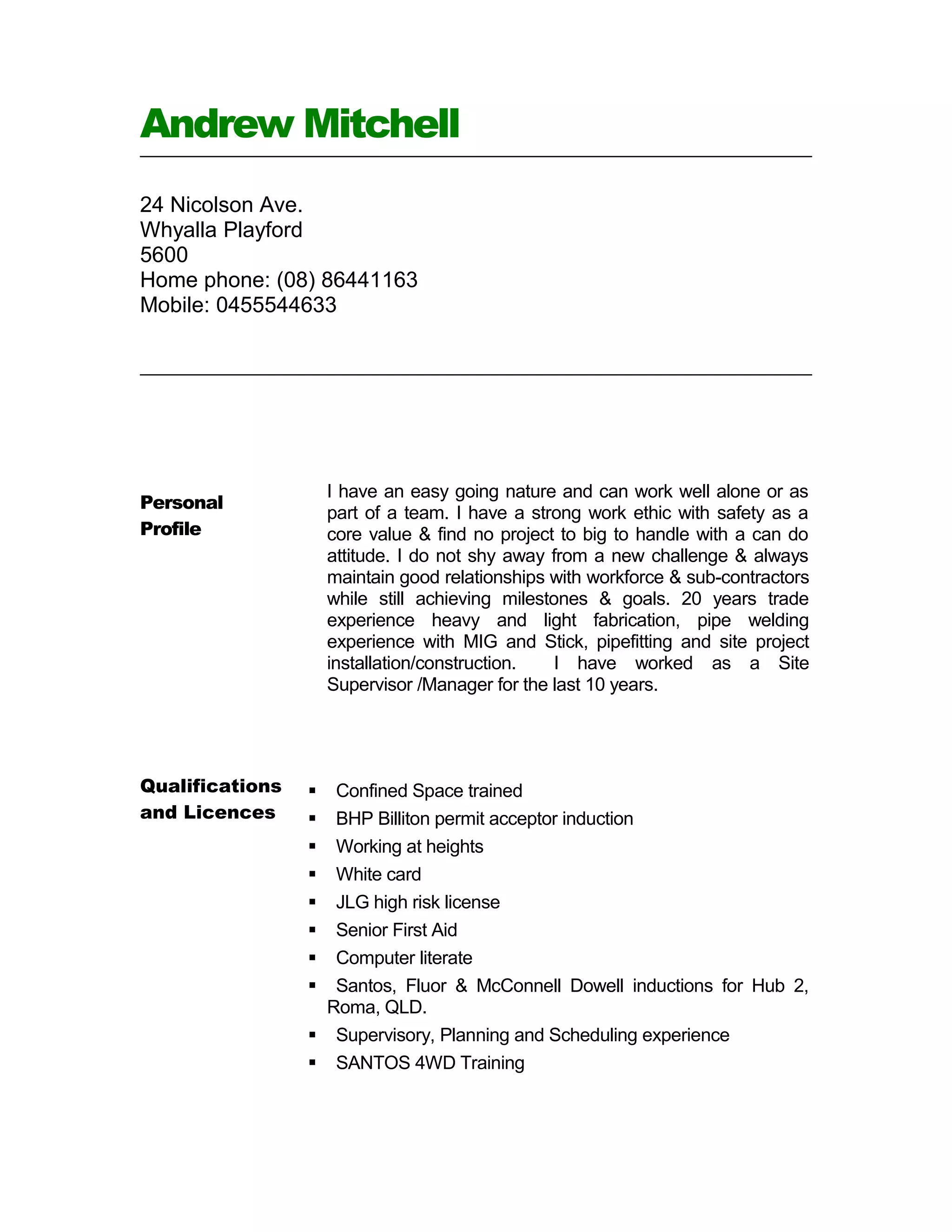 This document provides a summary of Andrew Mitchell's qualifications, experience, and references. It outlines his 20+ years of experience in heavy and light fabrication, welding, pipefitting, and construction site projects. He has 10 years of experience as a site supervisor/manager and has worked in roles such as senior workshop manager, site manager, operations manager, and site supervisor. The document also lists his qualifications, licenses, training, education and personal achievements.